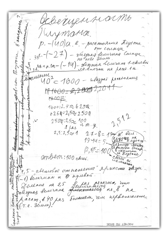Задача об освещённости малой планеты Плутон. Словесные пояснения сделаны маминой рукой.