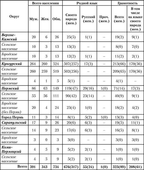 * Составлено и подсчитано по: Всесоюзная перепись населения 1926 г. Т. IV. Вот. р-н, Ур. обл., Башк. АССР. Отдел I. М., 1928. С. 106–147.