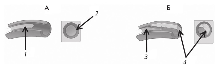 Рис. 5. Кровоток в нормальном артериальном сосуде (А) и в артериальном сосуде с атеросклеротической бляшкой (Б):1 – нормальный кровоток по артериальному сосуду; 2 – поперечный срез сосуда; 3 – измененный кровоток по сосуду с атеросклеротической бляшкой; 4 – атеросклеротическая бляшка