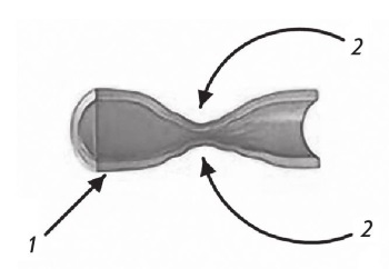 1 – участок нормальной артерии; 2 – участок спазмированной артерии