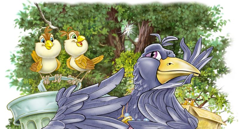 В этот момент птица вытащила размоченную корку из воды, ухватила когтями и взлетела. Вместе с ней поднялись в воздух ещё несколько ворон, которые увидели, что их подружка держит в лапах добычу, и начали гоняться за ней, чтобы отнять хлеб. Они всё время каркали и налетали на обладательницу богатства, ворона отвечала им, не забывая на лету перехватывать лапами корку.