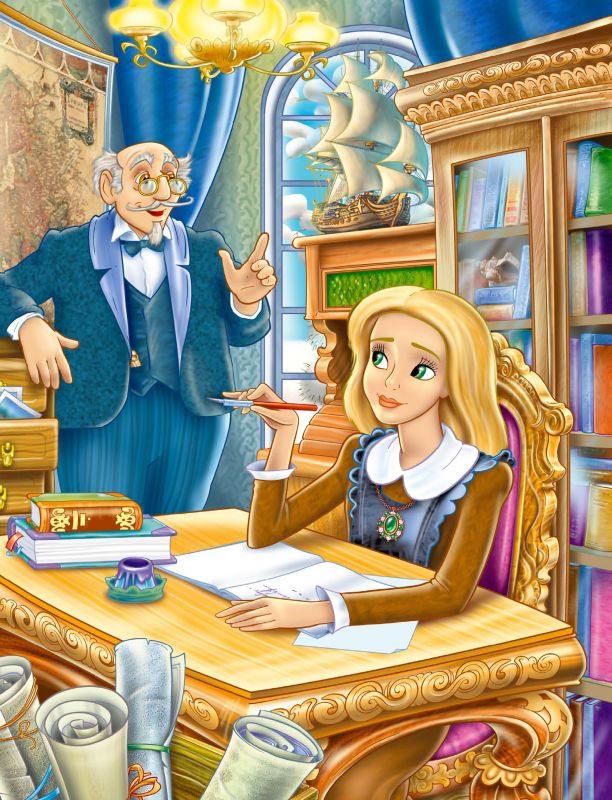 Тут Изумрудинка с удивлением обнаружила, что находится не в роскошном зале с колоннами, а в небольшой комнате со скромной обстановкой. Княжна была занята каким-то серьёзным делом: в коричневом платье с круглым воротничком и белоснежными манжетами, в строгом чёрном фартуке она сидела за изящным письменным столом, а перед ней стояла чернильница, лежали ручка с пёрышком и чистая тетрадь.