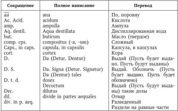 При выписывании рецептов в них допускаются сокращения (табл. 1). Они касаются как лекарственных веществ, так и лекарственных форм, а также действия фармацевта (возьми, смешай, дай таких доз, обозначь и др.). Сокращения должны быть общепринятыми, однозначно понятными и не вызывать у фармацевта сомнений. Иначе больной в лучшем случае не получит вовремя нужное ему лекарство.