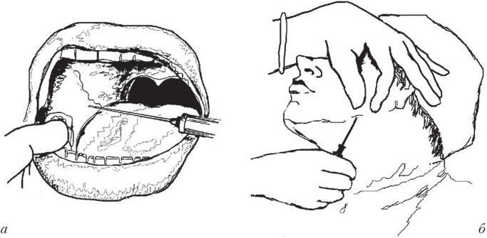При выполнении анестезии подчелюстным доступом иглу вкалывают в кожу под внутреннюю поверхность нижнего края челюсти, отступя на 1,5 см от угла, и продвигают ее по кости параллельно заднему краю ветви на 3,5 – 4 см. Здесь создают депо анестезирующего раствора в количестве 1 мл, чем обеспечивают блокирование нижнего луночкового нерва. Затем, продвинув иглу еще на 1 см, вводят 1 мл анестетика, выключая щечный и язычный нервы. При продвижении иглы на 4 см от нижнего края челюсти и введении в ткань анестезирующего раствора обычно не возникает необходимость в дополнительном перемещении иглы к язычному и щечному нервам, так как диффузия раствора обеспечивает обезболивание в зоне иннервации всех трех нервов (рис. 1.6, б). При проведении анестезии по изложенному способу у больных с короткой шеей следует вкалывать иглу без шприца, так как он мешает продвижению иглы по кости. Шприц присоединяют к игле, достигнув уровня нижнёчелюстного отверстия.
