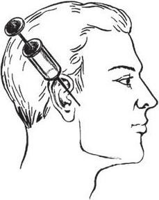 При выполнении анестезии подскуловым доступом (по Берше – Дубову) иглу вкалывают в кожу перпендикулярно к ее поверхности под нижним краем скуловой дуги на 2 см кпереди от основания козелка ушной раковины. Продвинув ее на глубину 3 – 3,5 см и достигнув тем самым внутренней поверхности наружной крыловидной мышцы, вводят 2 мл анестезирующего раствора. В результате через 8 – 10 мин происходит блокада нижнего альвеолярного, щечного и язычного нервов. Несколько раньше частично или полностью устраняется контрактура нижней челюсти (рис. 1.7).