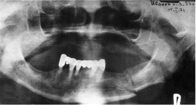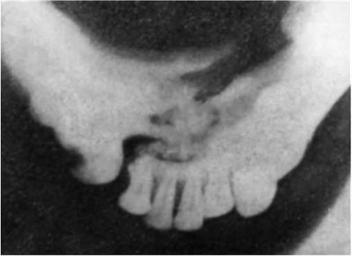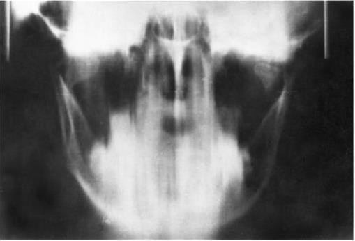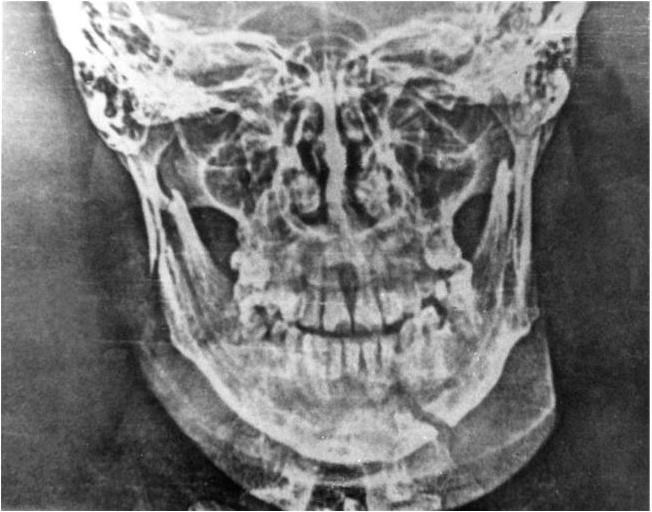 Рис. 3. Отпечаток с рентгенограммы подбородочного отдела нижней челюсти «на прикус». Отчетливо определяется перелом тела челюсти на уровне передних зубов