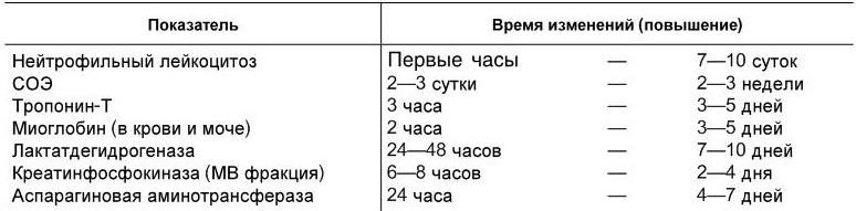 Лабораторная и инструментальная диагностика. Развитие инфаркта миокарда сопровождается типичными лабораторными изменениями, обусловленными наличием воспаления и поступлением в кровь энзимов и специфических белков из очага некроза (табл. 1.10).