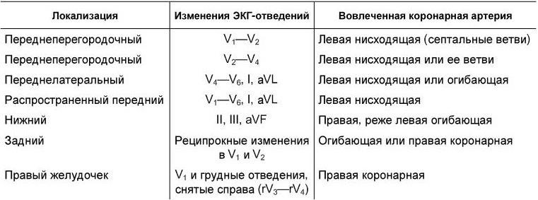 Топическая локализация инфаркта основывается на констатации максимальных изменений в определенных ЭКГ-изменениях (табл. 1.11).