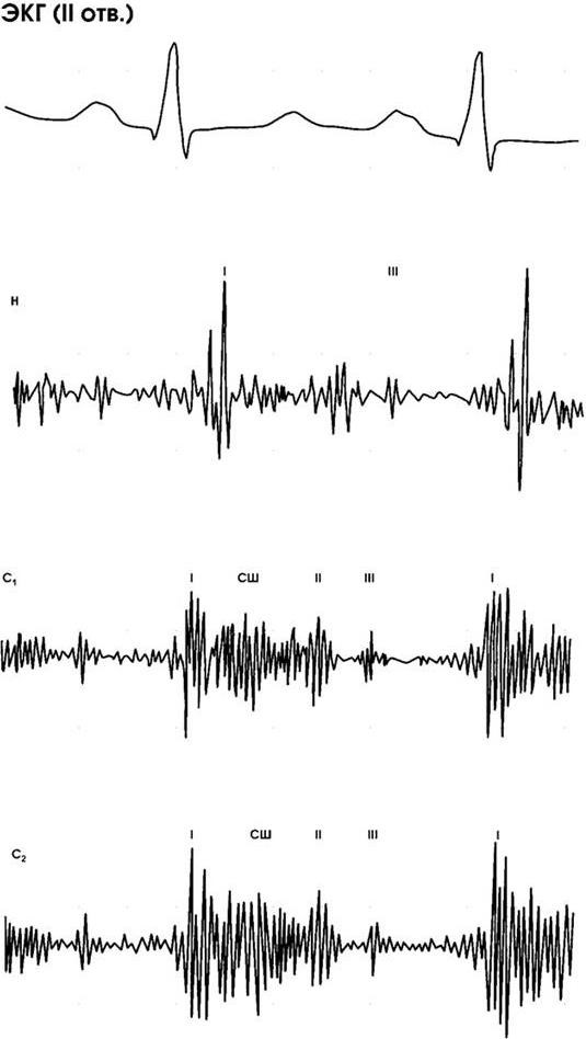 ФКГ зарегистрирована в области верхушки сердца. Пансистолический шум (СШ) возникает сразу после I тона. На всех частотах (Н – низкая частота, до 70 Гц; С