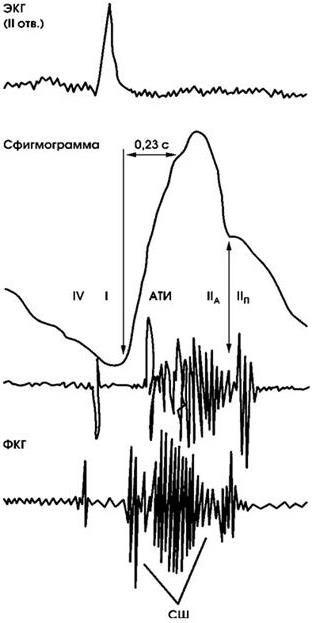 ФКГ зарегестрирована в III межреберье слева у грудины. АТИ – аортальный тон изгнания; СШ – систолический шум ромбовидной формы