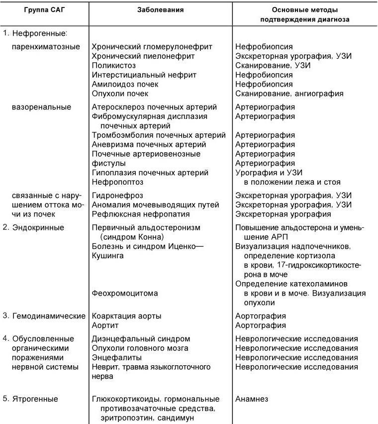 Дифференциальный диагноз. Частота симптоматических артериальных гипертензий (САГ) среди всех пациентов с повышением артериального давления не достигает 10 %. Известно около 50 заболеваний, при которых возможно повышение артериального давления. Некоторые из них встречаются достаточно часто (гломерулонефрит, пиелонефрит), другие могут быть отнесены к казуистике (ренинома, острая порфирия).