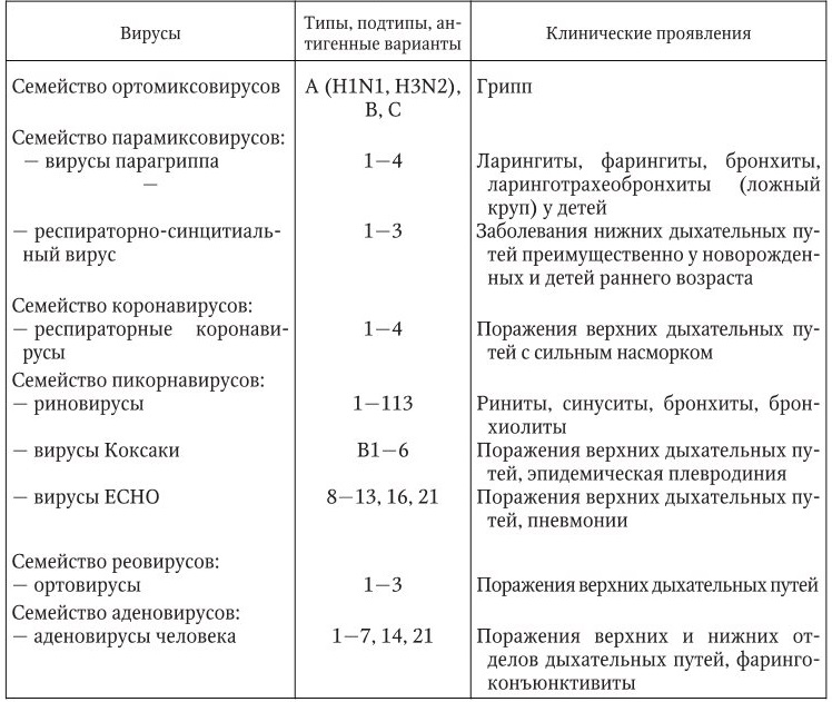 Среди существующих вирусов по числу вызываемых ими заболеваний и умерших от них больных лидирующее место занимают возбудители острых респираторных вирусных инфекций (ОРВИ). Более 200 вирусов могут быть причиной возникновения ОРВИ, что чрезвычайно затрудняет проведение диагностики. Да и сам термин ОРВИ вряд ли соответствует требованиям, предъявляемым к этиологическому диагнозу инфекционного заболевания, что зачастую ведет к неоправданному или неуместному его употреблению в клинической практике, тем более что, помимо вирусов, несколько десятков видов бактерий, хламидий, микоплазм способны поражать дыхательные пути (табл. 4).