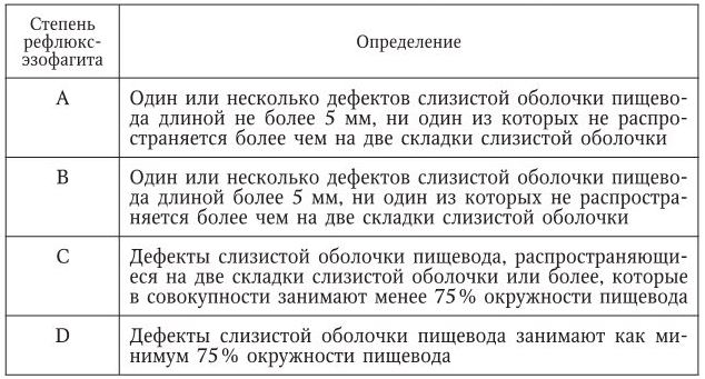 Эндоскопическая диагностика рефлюкс-эзофагита с нарушением целостности слизистой оболочки пищевода проводится согласно Лос-Анджелесской классификации 1994 г., при использовании которой в зависимости от объема поражения слизистой оболочки выделяют четыре степени рефлюкс-эзофагита (табл. 1).
