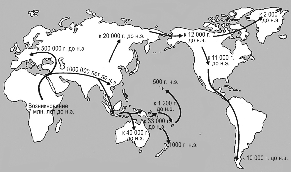 От первых Homo sapiens нам не осталось ни искусства, ни костяных артефактов, ничего, кроме скелетных останков и упомянутых грубых каменных орудий. На этом этапе всемирной истории в Австралии люди даже еще не появились – поскольку, чтобы перебраться туда из Юго-Восточной Азии, им понадобились бы навыки мореплавания и судостроения. Не было людей и в обеих Америках, поскольку это потребовало бы сперва заселить ближайшую часть Евразии (Сибирь), а в какие-то периоды, опять же, наличия хотя бы рудиментарных навыков судостроения. (В эпоху следовавших друг за другом оледенений, то поднимающих, то опускающих уровень моря, мелкий Берингов пролив, отделяющий сегодня Сибирь от Аляски, превращался попеременно то в пролив, то в широкий межконтинентальный перешеек.) Ни к строительству судов, ни к выживанию в холодной Сибири ранний Homo sapiens был еще не способен.