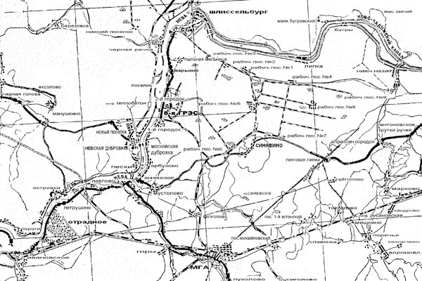 Для района была характерная довольно редкая дорожная сеть. С юга в меридиальном направлении к Шлиссельбургу вело расположенное вдоль берега Невы старое шоссе, которая также поворачивала на Мгу, Сологубовку, Шапки и Любань. Также грунтовые меридильные дороги проходили от Синявино, через Рабочий посёлок № 5 до Рабочего посёлка № 2 и от Рабочего посёлка № 5 до деревни Пильная Мельница на берегу Невы.