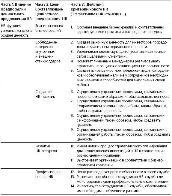 Суть ценностного предложения HR представлена в табл. 1.1. На самом простом, первом уровне, трансформация HR означает, что все заинтересованные группы должны получать ценность от работы HR. Вдохновленные этой идеей, вы можете показать своему руководству, почему нужно трансформировать функцию HR в вашей компании, и как та ценность, которую вы создаете, соотносится с существующими реалиями организации. На втором уровне вы определяете элементы, создающие эту ценность. Для того чтобы ценность создавалась в полном объеме, все пять элементов должны работать одновременно. На третьем уровне вы даете определение 14 критериям эффективности HR-службы. Таким образом, на первом уровне ценность – это видение, на втором – элементы являются целями, а на третьем – критерии эффективности предполагают соответствующие изменения, необходимые для обеспечения полной трансформации HR-функции.