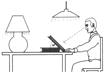 Книгу лучше всего установить под углом 45 градусов по отношению к глазам, как показано на рис. 1. При таком ее положении глазам не придется постоянно адаптировать угол зрения. В результате нагрузка на них снизится, а чтение будет менее утомительным. Вам будет легче, если взять книгу или папку толщиной пять-семь сантиметров и поместить под книгу, которую вы читаете. Это поможет достичь угла в 45 градусов, наиболее удобного для чтения.