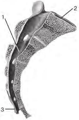 1 – sacral canal (canalis sacralis), 2 – base of sacrum (basis ossis sacri); 3 – sacral horn (cornu sacrale)