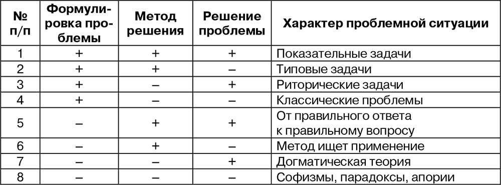 Методы решения проблемы могут быть известны заранее, а могут быть найдены в процессе работы. В зависимости от того, что известно (формулировка проблемы, метод ее решения или ответ) Нуреев Р. М. [55, 26] приводит типологию проблемных ситуаций (см. табл. 1).