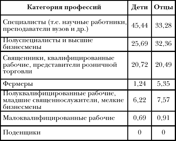 Почему же тогда такие «обнадеживающие» результаты получились у Термена? Это нетрудно понять, если рассмотреть приведенную самим Терменом таблицу, где дается сопоставление профессионального положения, которого достигли 725 мальчиков, охваченных его обследованием, и профессионального положения их отцов. Вот эта таблица (в процентах).