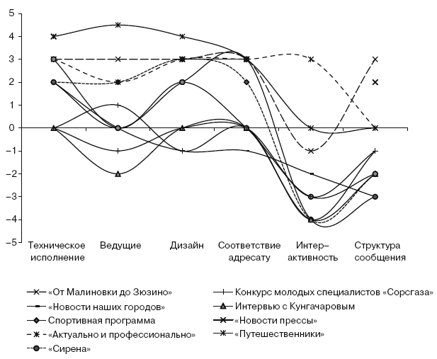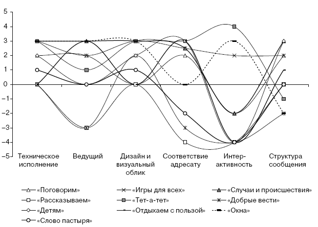 За счет большего разнообразия элементов (опрос на улице, беседа в студии, нарезки из фотографий и т. д.), более интересного визуального решения (использование крана, студийные съемки с разных планов), большей локализации (опрос на улице местного населения) и интерактива (звонки и розыгрыши в студии) эфир в целом удачный (рис. 1.13). Однако структура при этом несовершенна. Очень слабый гороскоп (обилие текстовых элементов не телевизионно) и подборка клипов (совершенно разных зачастую музыкальных направлений).