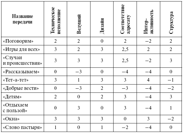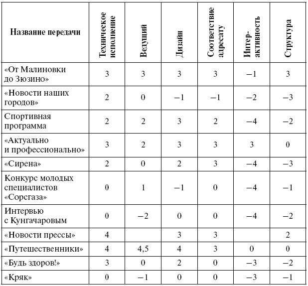 Передачи дневного вещания, по оценкам экспертов, проигрывают передачам вечернего. В частности, довольно слабым выглядит программирование дневного эфира – второй повтор вечерних новостей предыдущего дня. Есть смысл либо оставить один утренний повтор новостей, либо один дневной, но никак не оба сразу. Оценки вечерних и дневных программ ТРК «Параллель» приведены на рис. 1.15 и в табл. 1.2.