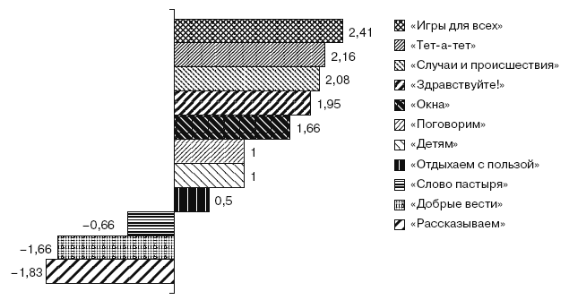 Количество передач, оцененных выше 0, в сетке ТРК «Параллель» больше. Самыми удачными признаны передачи «Игры для всех», «Тет-а-тет», «Случаи и происшествия». Самыми неудачными эксперты признали передачи «Рассказываем», «Добрые вести» и «Слово пастыря» (по странному обстоятельству, авторство всех программ одинаковое) (рис. 1.12).