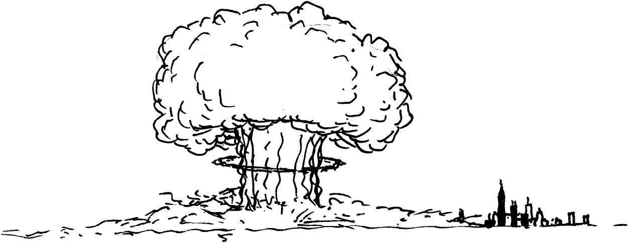 Представьте, что вы наблюдаете за этим с холма, расположенного вне города. Первое, что вы увидите, – ослепляющий свет, гораздо более яркий, чем солнце. Он постепенно тускнеет в течение нескольких секунд, и растущий огненный шар превращается в грибовидное облако. Затем раздается нарастающий грохот и приходит взрывная волна, ломающая деревья и сравнивающая с землей дома.