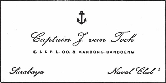– Скажите ему, что с ним хотел бы переговорить Captain van Toch из Сурабаи. Ja, – вспомнил он, – вот визитная карточка. – И он вручил пану Повондре визитку, на которой был изображен якорь и напечатано имя: