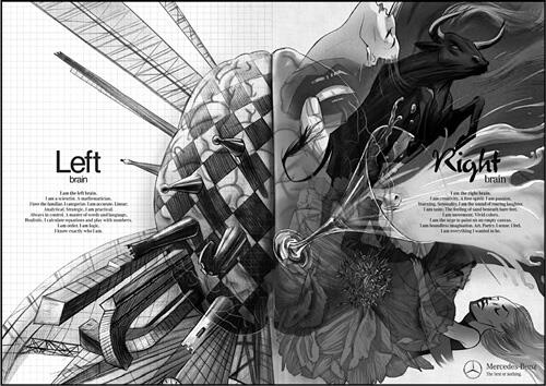Объявление дает понять, что рекламируемый автомобиль доставит удовольствие как левой половине нашего мозга, так и правой. Все будет прекрасно как в прагматическом, так и в эмоциональном плане.