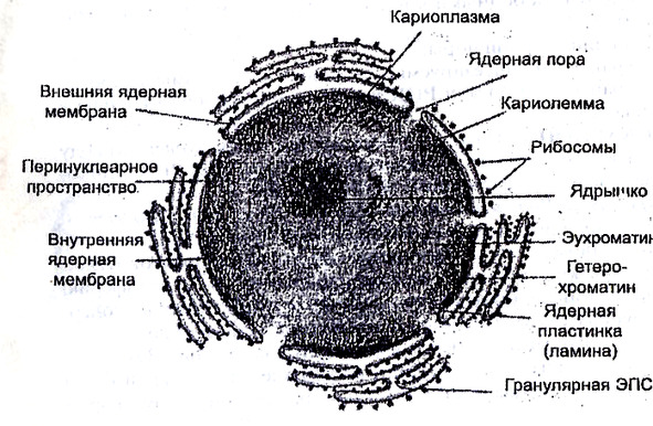 ІІ. Ядро – центральный аппарат клетки, с которым связано хранение и передача генетической информации, обмен веществ, движение и размножение. Форма ядра чаще округлая или вытянутая, реже дольчатая. От цитоплазмы его отделяет кариолемма (ядерная оболочка). Она состоит из наружной и внутренней ядерных мембран, разделенных бесструктурным веществом. Мембраны имеют поры, обеспечивающие избирательную связь с цитоплазмой. Общее их количество в клетке 3—4 тысячи. Каждая пора встроена в крупную дисковидную структуру, называемую поровый комплекс ядерной оболочки. Заполнено ядро гомогенной массой нуклеоплазмой. В ее состав входят нуклеиновые кислоты и белки.