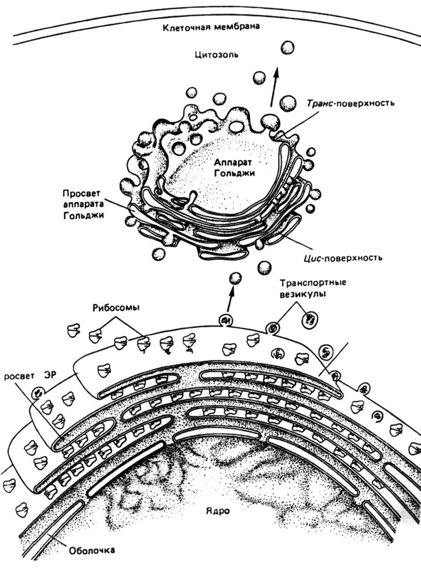 Гладкий ЭР несет мембраны, лишенные рибосом. Здесь происходит синтез липидов и углеводов. ЭР объединен с ядром клетки, поскольку наружная мембрана ядра непосредственно переходит в мембраны ЭР. Гладкий и гранулярный ЭР связаны друг с другом, но отличаются по составу содержащихся в них белков. Все белки, подлежащие выведению из клетки, проходят путь от рибосом в полость ЭР, оттуда в аппарат Гольджи, а затем в секреторные везикулы (пузырьки), которые выводятся из клетки. Белки, предназначенные для внутриклеточных нужд, используются митохондриями или другими органеллами и никогда не поступают в ЭР (рис. 9).