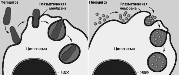 Рис. 6. Схема фагоцитоза и пиноцитоза.