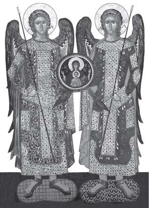 Высшую иерархию[4] непосредственно близко стоящих к Богу составляют Ангелы, носящие имена Серафимы, Херувимы и Престолы. Серафимы соответственно своему имени имеют сердца, пламенеющие любовью к Богу, и призывают и других пламенно любить своего Создателя. Херувимы имеют полноту знания и обилие премудрости.