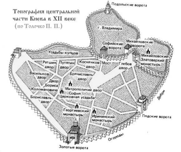 Согласно археологическим раскопкам, Киев возник на месте гнезда славянских поселений, располагавшихся в VII – IX веках на Старокиевской горе и её склонах, горах Киселёвке, Детинке, Щековице и на Подоле. Поселения перемежались пустыми пространствами, пашнями и могильниками. Древнейшее городище располагалось на северо-западе Старокиевской горы. По мнению Б. А. Рыбакова, оно датируется концом V – нач. VI вв. В конце IX века бурно развивается киевский Подол, здесь появляется дворовая застройка и уличная планировка.