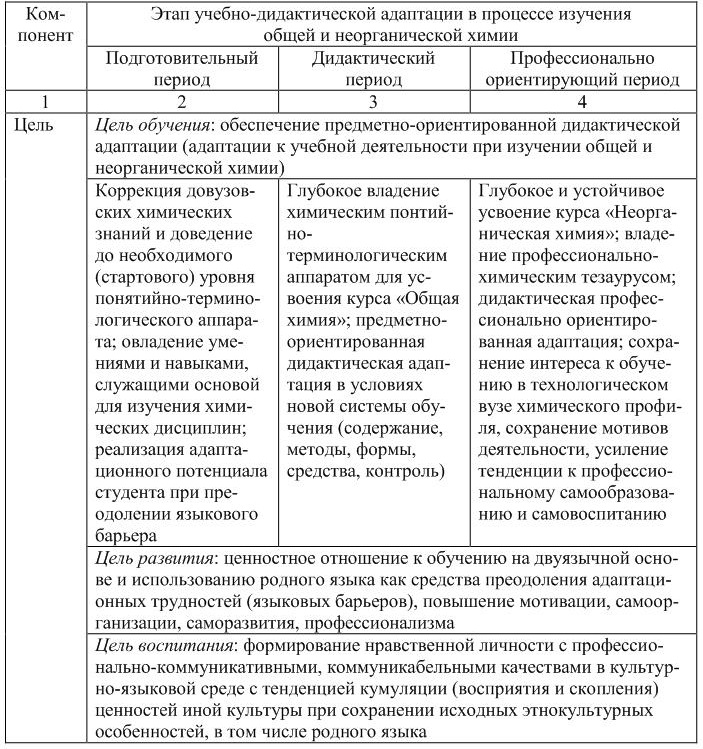 Центральное звено в структуре процесса учебно-дидактической адаптации составляет адаптационное обучение химии на двуязычной основе, требующее собственного моделирования. Однако для моделирования любой педагогической системы необходимо выделение таких компонентов, как цель, содержание, формы, методы и средства обучения. С учетом важности в процессе адаптации первокурсников каждого периода (подготовительного, дидактического и профессионально ориентирующего) и компонентов учебно-дидактической адаптации в эти периоды модель адаптационного обучения химии на двуязычной основе нами построена с выделением компонентов (по горизонтали) и периодов – по (вертикали) (табл. 1).