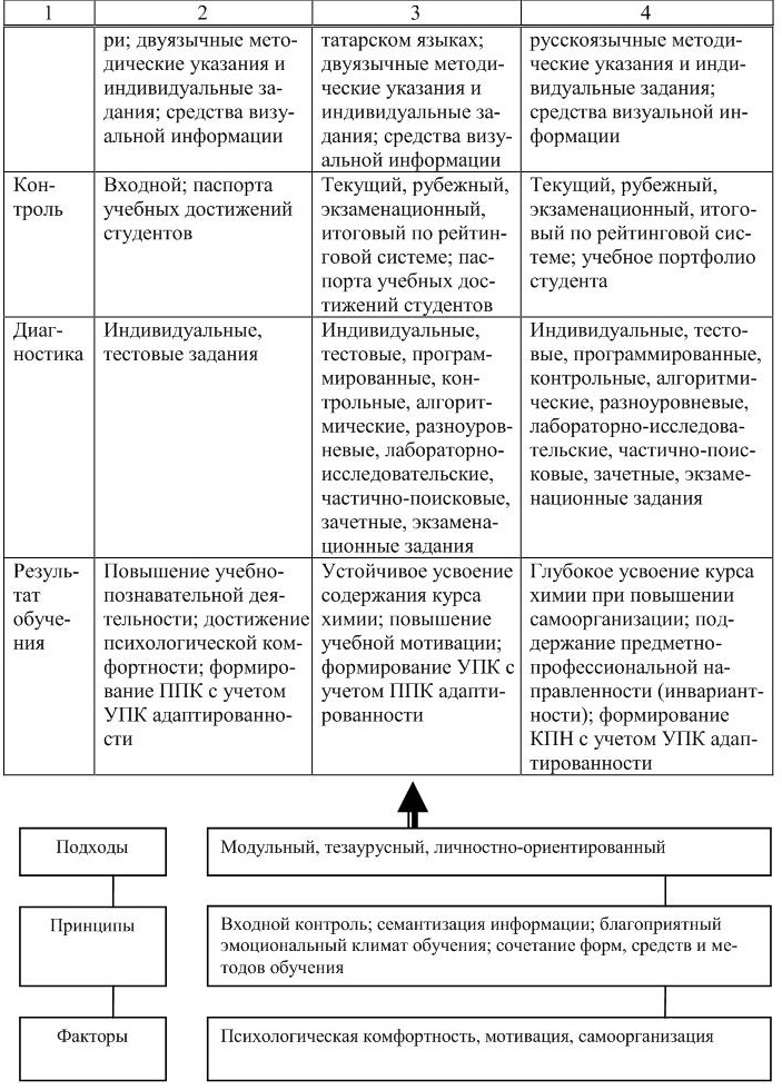 3) Содержательный компонент модели адаптационного обучения химии на двуязычной основе предусматривает структурирование учебного материала, его представление в виде учебных блоков, модулей, учебных элементов, дидактических единиц в соответствии с модульным подходом; в виде дескрипторов, отнесенных к теоретическому ядру дисциплины (первичные понятия и категории, моделиобъекты), к базисному содержанию (теории, законы, принципы, базовые понятия и производные от них, уравнения), к функциональному содержанию (теоремы, правила) в соответствии с тезаурусным подходом; укрупнение дидактических единиц; алгоритмизацию (ориентировочная основа действия). Средством реализации этих подходов является учебно-методический комплекс, способствующий преодолению языкового барьера через освоение ПТА (совокупности дидактических единиц и дескрипторов) на двух обучающих языках, усвоению предметного содержания, накоплению профессионального тезауруса как средства подготовки специалиста.