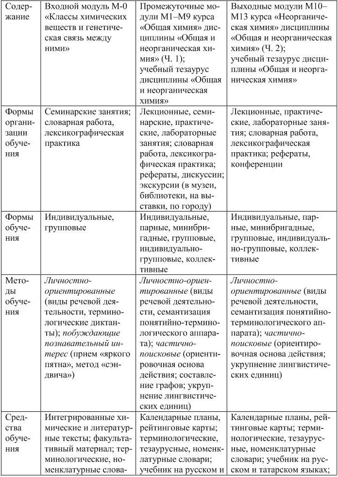 В соответствии с модульным подходом в содержании общей и неорганической химии нами выделены входной модуль «Классы химических веществ и генетическая связь между ними», актуализируемый в подготовительном периоде адаптации; промежуточные модули курса «Общая химия», изучаемые в дидактический период адаптации, и выходные модули курса «Неорганическая химия», обобщающие знания студентов в профессионально ориентирующем периоде этапа учебно-дидактической адаптации (прил. 1–3).