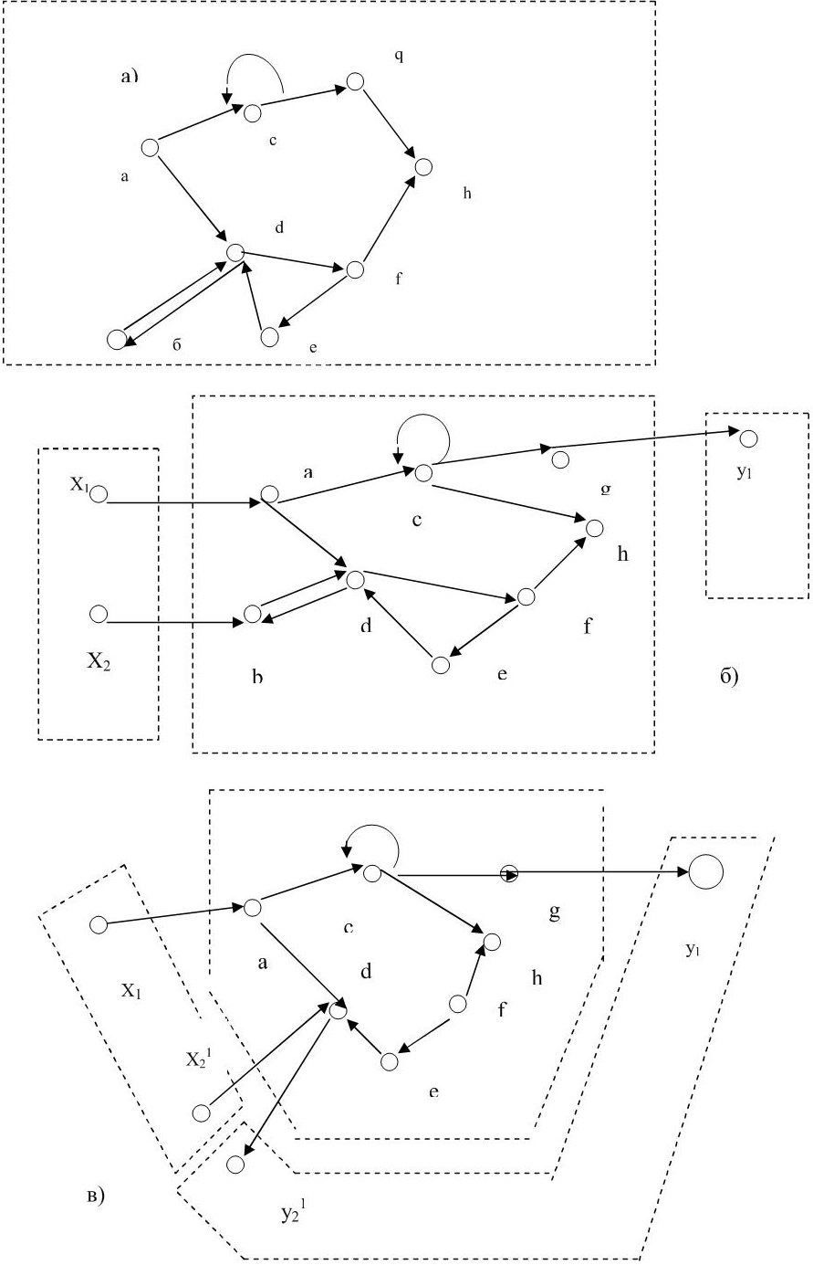 Элементов множество. Возьмем пример, что связи между элементами системы являются направленными по линии воздействия одного элемента на другой. Представим систему в виде ориентированного графа (рисунок 2), где элементы представлены вершинами, а связи между ними – дугами. Воздействующий элемент является предшествующим, и начало стрелки связи, идущей от него (начало дуги), – выходом этого элемента. Элемент, испытывающий воздействие, является последующим, и конец стрелки связи, поступающей в него (конец дуги), есть вход этого элемента. Частными случаями являются: взаимодействие двух элементов (b и d на рисунке 2 а), когда соединяющие две смежные вершины дуги образуют контур, и самосопряжение элемента, когда его выход возвращается на вход, т.е. образуется петля (с на рисунке 2а). У замкнутой системы элементы взаимодействуют лишь внутри системы. Для варианта незамкнутой системы такая однозначная идентификация невозможна. Здесь элементы могут быть отнесены либо к системе, либо к среде, т.е. к другой системе: вершина b на рисунке 2a стала входом х