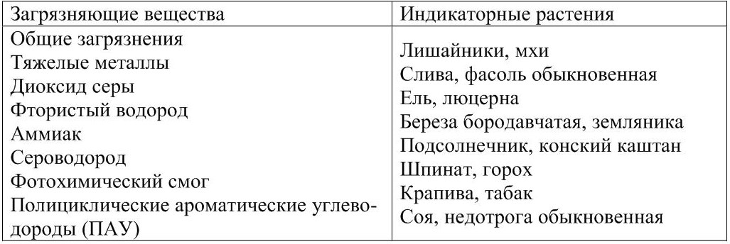 Индикаторные растения – растения, дающие визуально определяемые признаки поражения теми или иными загрязняющими веществами и их смесями. Определенные виды и расы высших сосудистых растений реагируют на газообразные и твердые вещества, причем на такие концентрации этих веществ в атмосфере, которые не вызывают реакции человека и животных, и эти реакции можно прогнозировать. Многие растения могут служить индикаторами присутствия тех или иных загрязняющих веществ в атмосферном воздухе, реакции же других могут быть связаны с влиянием определенных концентраций специфических загрязняющих атмосферу веществ (таблица 2).