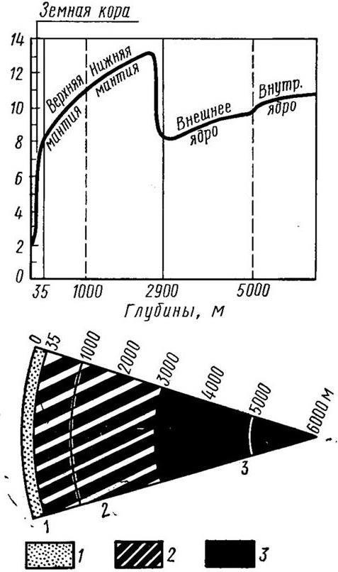 Рисунок 2 – Геосферы Земли, выделяемые по скоростям распространения продольных сейсмических волн: 1 – земная кора; 2 – мантия; 3 – ядро