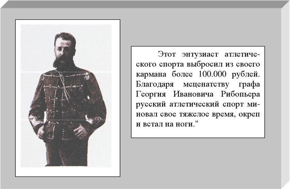 В своей книге "Тяжелая атлетика" И.В. Лебедев пишет: "Если доктор В.Ф. Краевский – был "отцом русской атлетики", то граф Г. И. Рибопьер был ее "кормильцем".