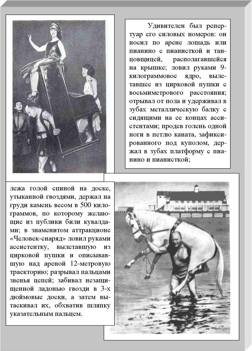 С тех пор его сын жил только цирком. Он убедил отца выписать из Москвы книги по физическому развитию. И вскоре пришла книга знаменитого в то время атлета Евгения Сандова «Сила и как сделаться сильным».
