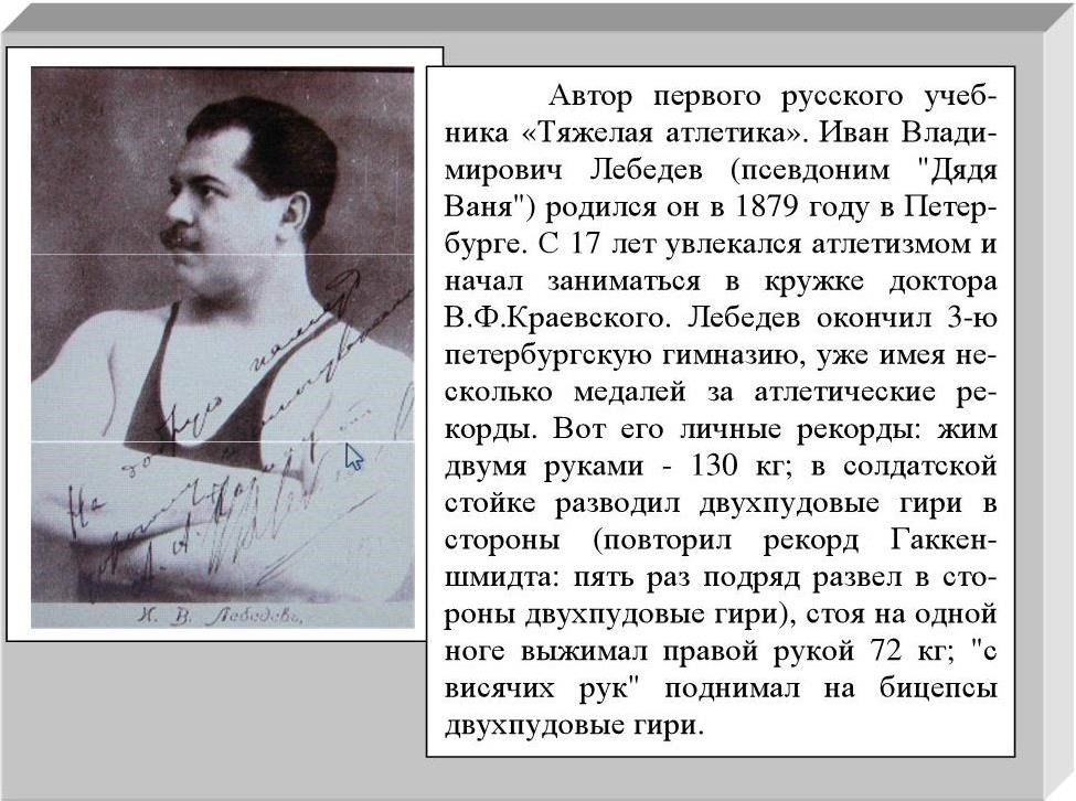 Из подсчетов, проведенных в 1912 году, выяснилось, что за пятнадцать лет у Лебедева перебывало. десять тысяч учеников! Из одних ему удалось сделать подлинных атлетов, другим он только помог нарастить мускулатуру. Но частицу своей души он вложил в каждого. В последние годы "дядя Ваня" Лебедев жил за Уралом, в Свердловске. До преклонных лет работал – тренером, читал лекции по физическому развитию. Умер Иван Владимирович в 1950 году.
