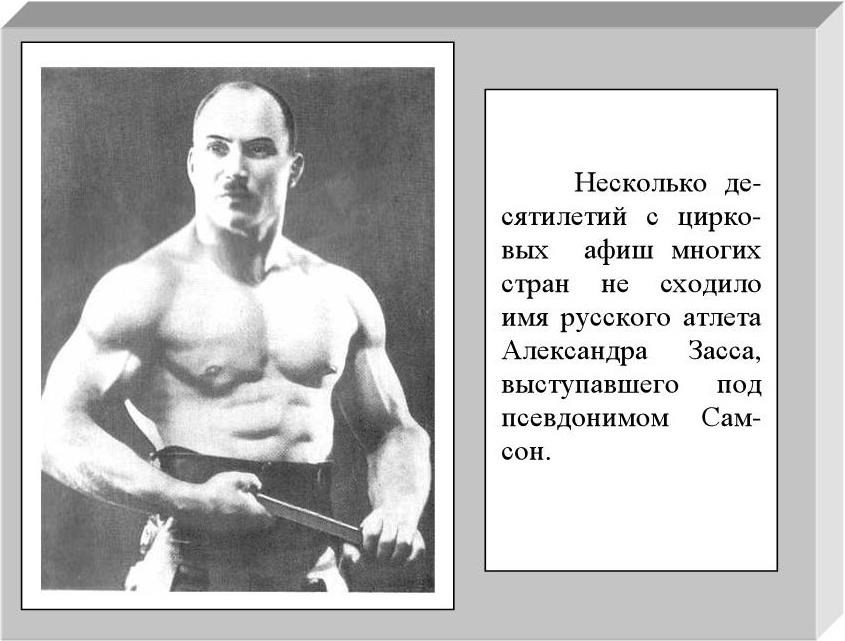 Конечно, у Александра Засса была огромная природная сила, чем вообще отличались его предки. Однажды он в родном Саранске побывал с отцом в цирке. Мальчику особенно понравился могучий силач, разрывавший цепи, гнущий подковы, который в конце своего выступления, как было принято, обратился к публике, приглашая повторить его трюки.
