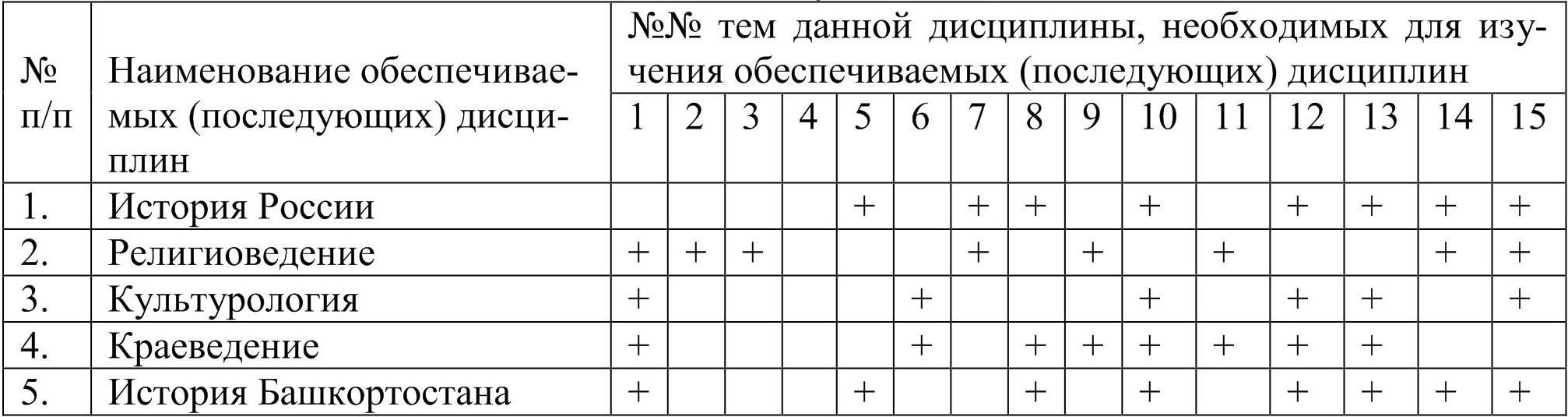 Дисциплина "История культуры Башкортостана" относится к "Гуманитарному, социальному и экономическому циклу". Для изучения данного курса у студента должны быть входные знания, умения и компетенции по дисциплинам: "История России", "Культурология", "Религиоведение", "Краеведение", "История Башкортостана".