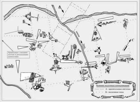 На одном из склонов Анд, выходящих к океану, начертан огромный знак – «трезубец». Он виден и с воды и с воздуха, то есть с малых и больших высот. Посмотрите внимательно, зубья ли там нарисованы? Скорее, это начертаны не три зуба, а три птичьих пера – символ легкости, полета. И стремятся перья вверх. Они как три силы тяги, вцепившиеся в носовую часть и консоли вписанного в знак силуэта двухкилевого летательного аппарата.