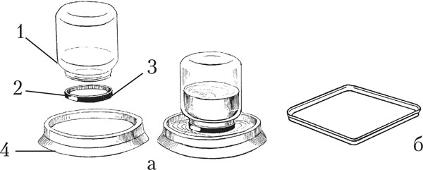 Кормушки и поилки для цыплят: а – вакуумная поилка: 1 – емкость для воды; 2 – отверстие для вытекания воды; 3— подставка; 4 – миска; б – лотковая кормушка