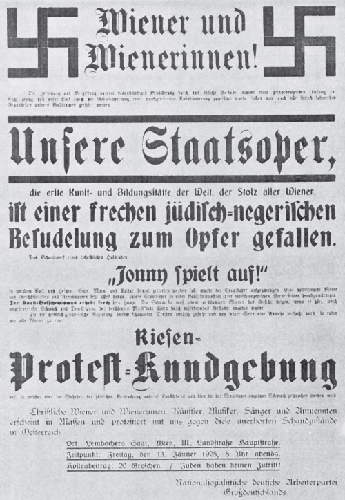 2–6. Плакат австрийской нацистской партии, напечатанный в 1928 году, за десять лет до вступления Гитлера в Вену, протестующий против исполнения в Венском оперном театре оперы еврея Эрнста Кшенека: “Наш оперный театр, ведущее художественное и образовательное учреждение мира, гордость всех венцев, стал жертвой наглого еврейско-негритянского осквернения. <…> протестуйте вместе с нами против этого неслыханного в Австрии позора”. (Копия любезно предоставлена Венской библиотекой в ратуше.)