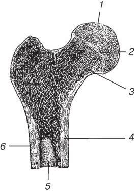 1 – проксимальный (верхний) эпифиз; 2 – метафиз; 3 – губчатое вещество; 4 – компактное вещество; 5 – костномозговая полость; 6 – диафиз (тело)